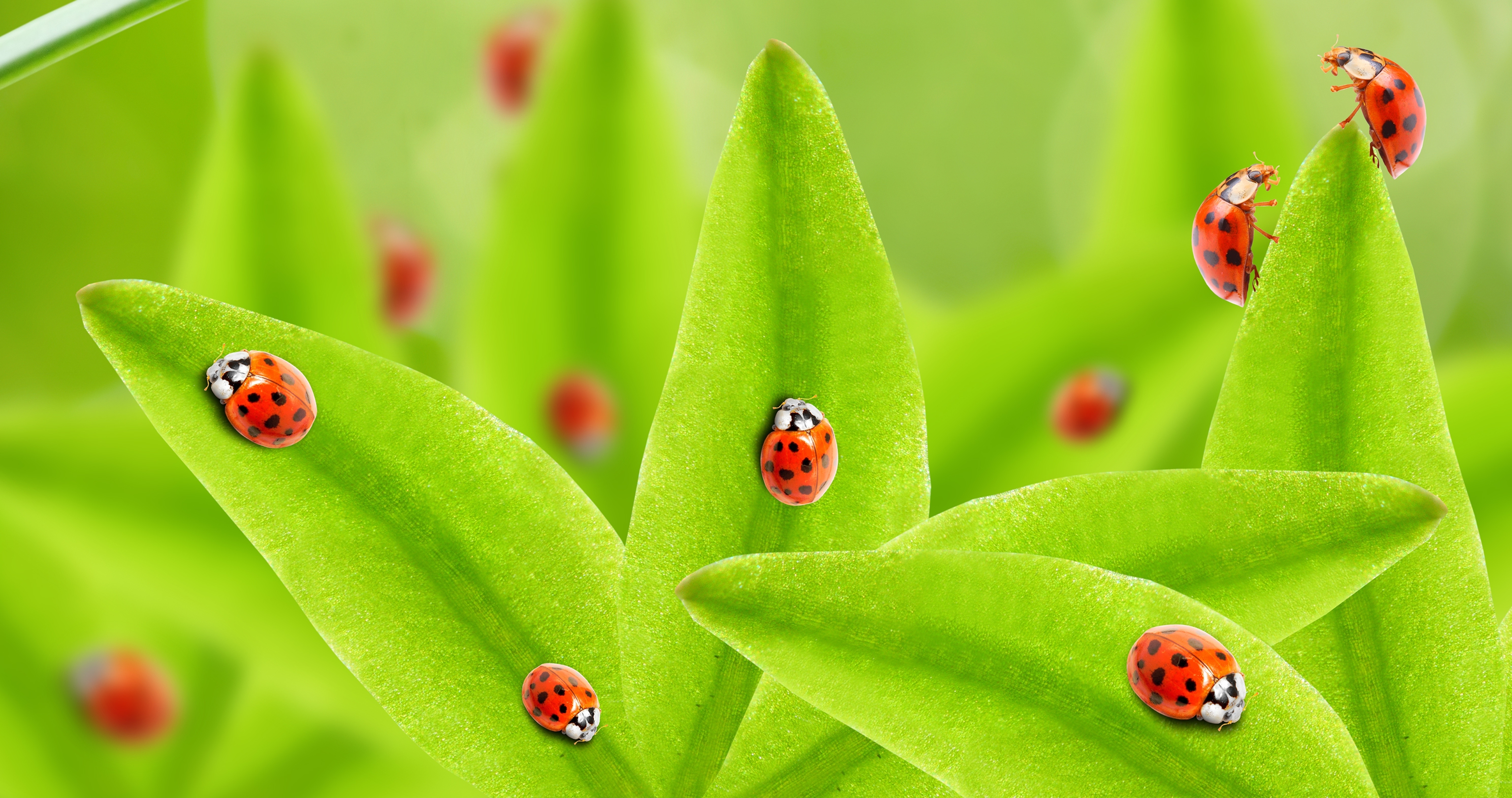 Много божьих коровок на зеленых листьях - 5953x3142