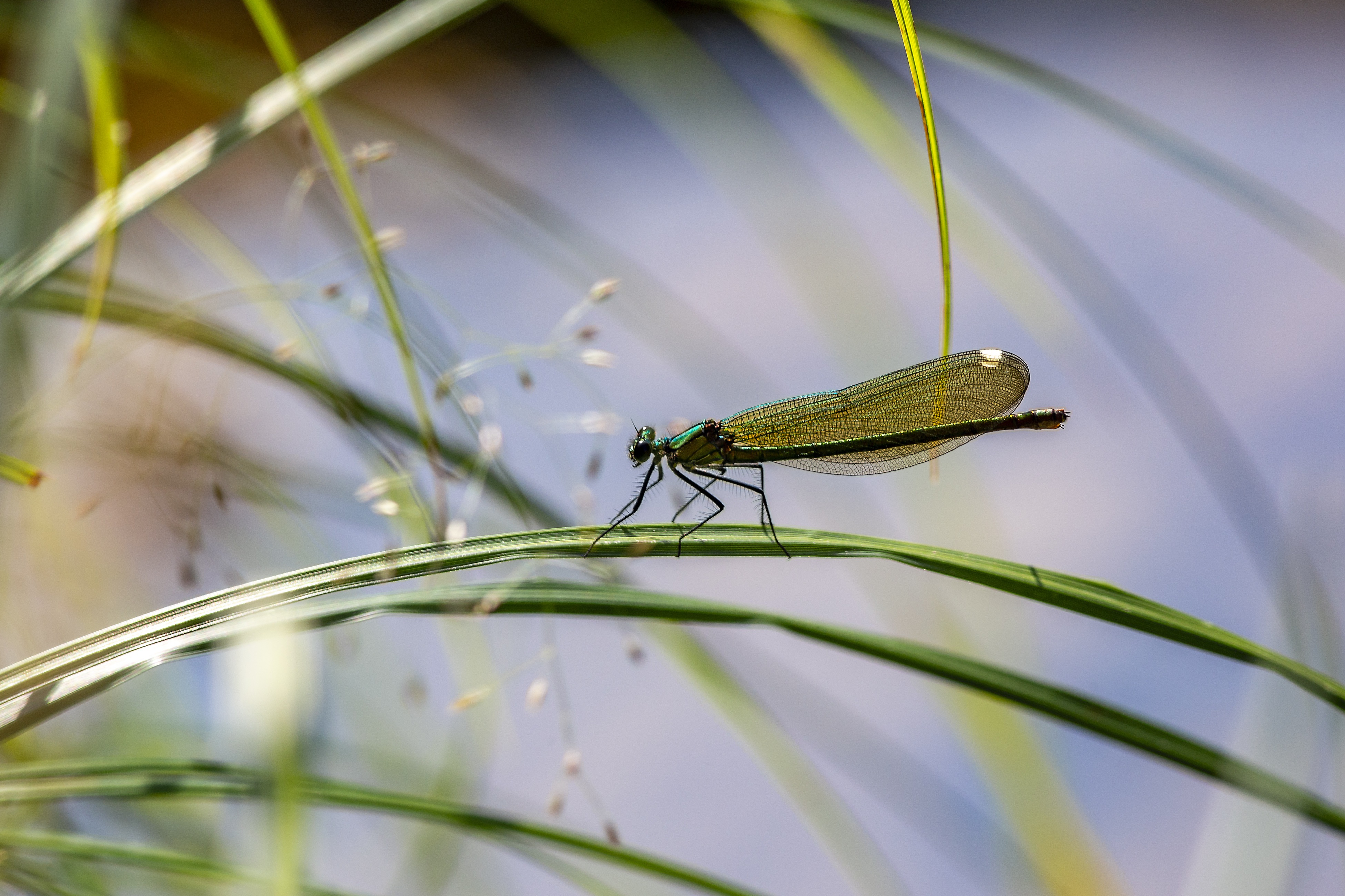 Маленькая зеленая стрекоза сидит на траве - 3900x2600