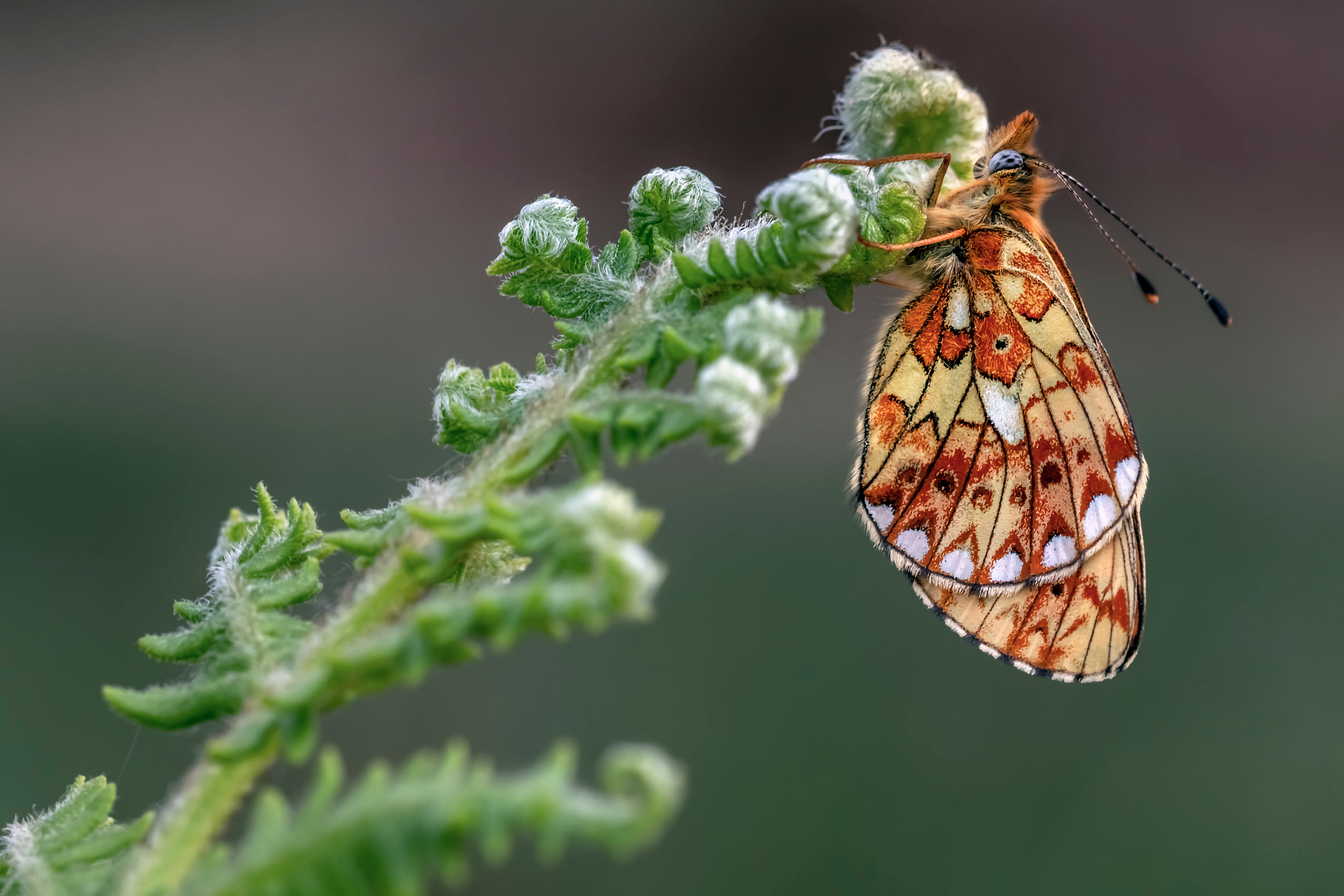Коричневая бабочка на зеленом цветке папоротника - 4562x3041