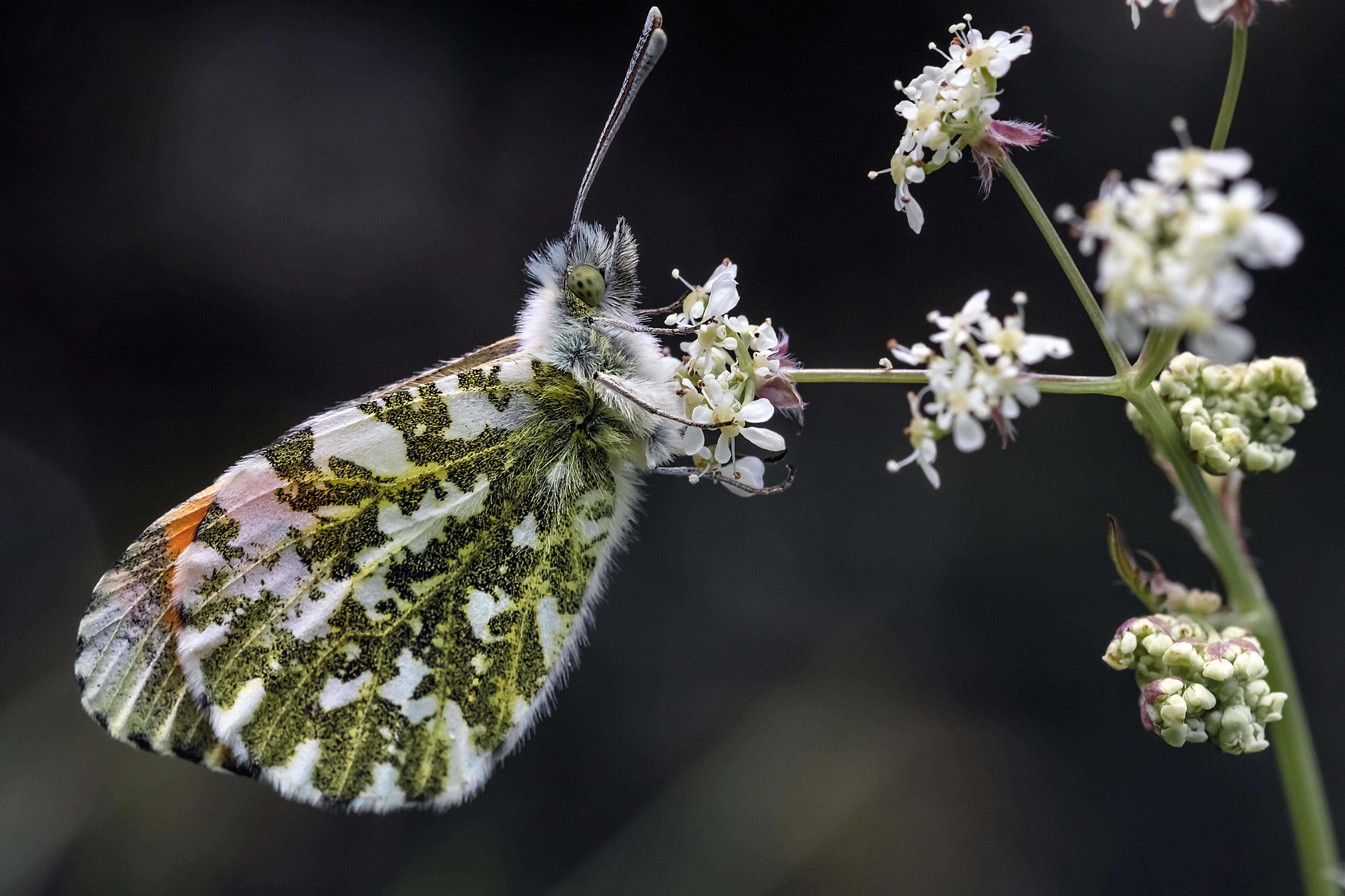 Зеленая бабочка сидит на белом цветке - 4562x3041