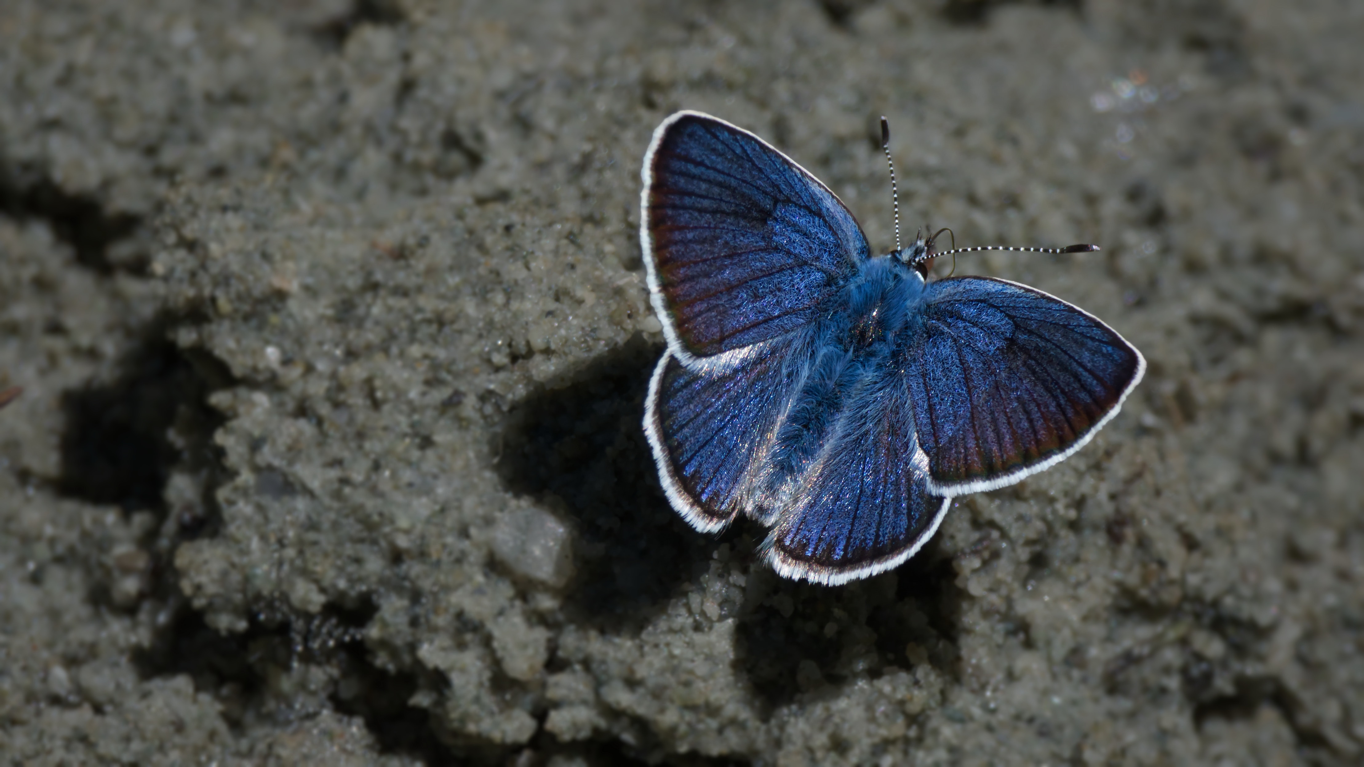 Голубая бабочка сидит на песке - 4434x2494