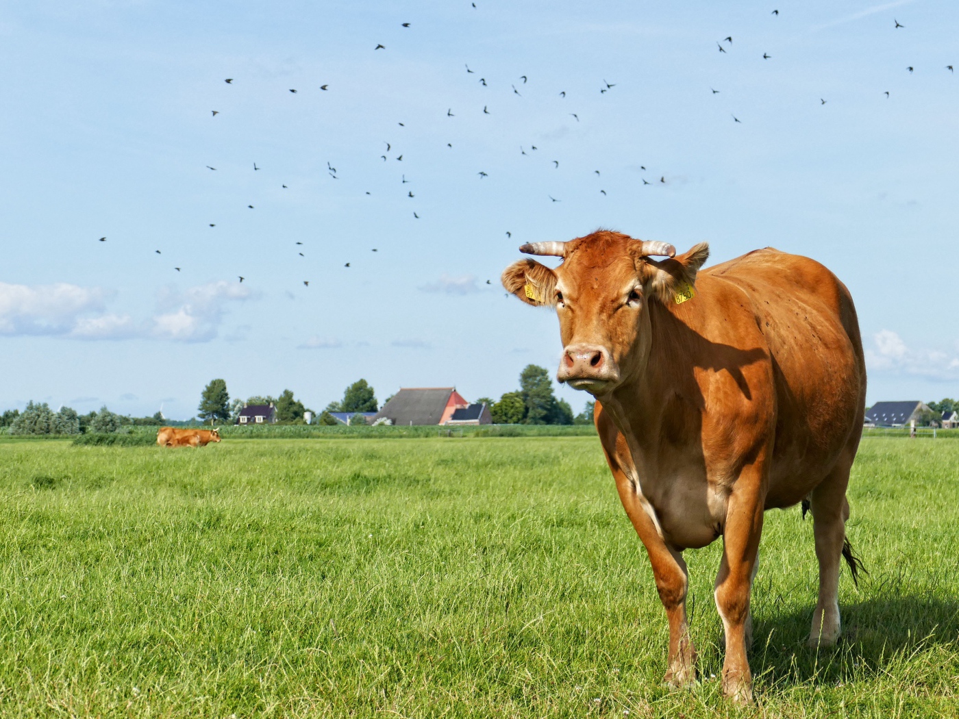 Большая домашняя корова пасется на зеленой траве Обои для рабочего стола 1400x1050