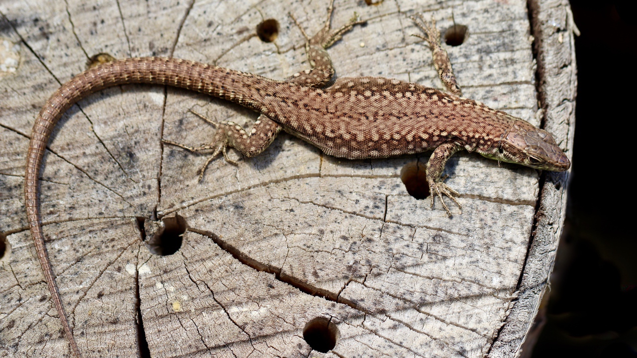 Красивая ящерица на старом пне Обои для рабочего стола 1280x720