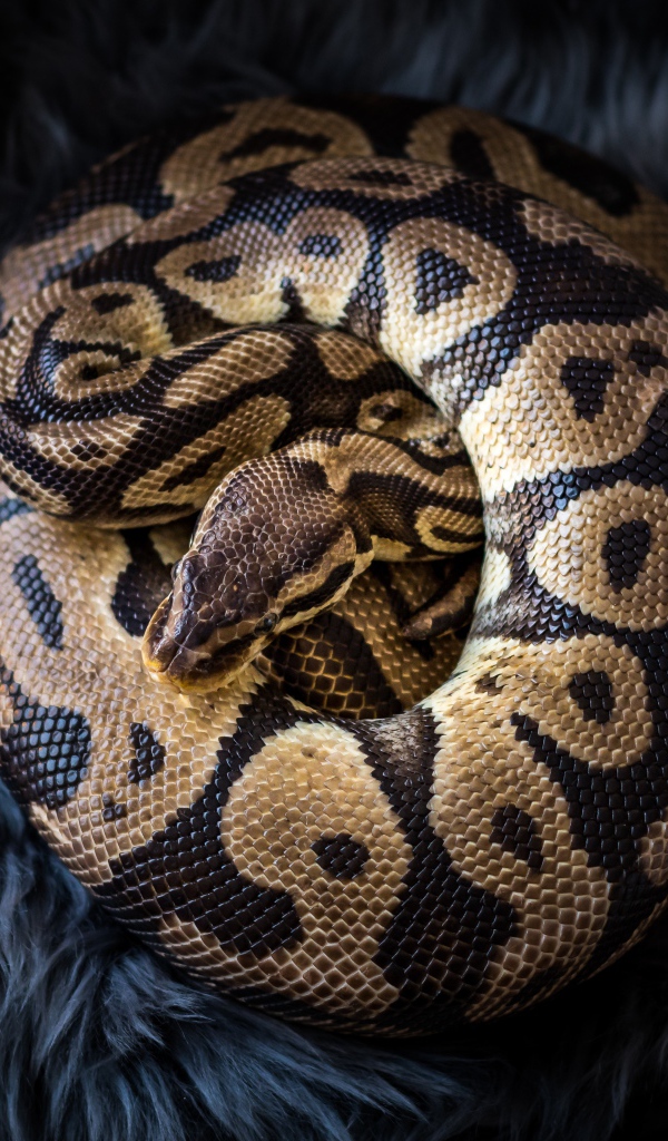 Большой красивый питон лежит на черном меху Обои для рабочего стола 600x1024