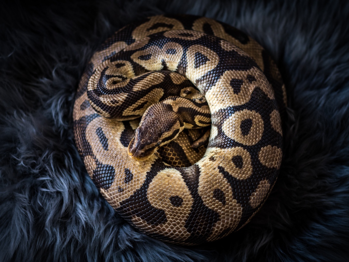 Большой красивый питон лежит на черном меху Обои для рабочего стола 1152x864