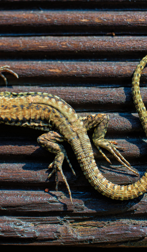 Большая ящерица на деревянной лавке Обои для рабочего стола 600x1024