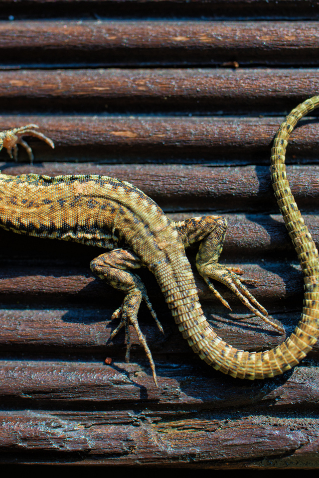 Большая ящерица на деревянной лавке Обои для рабочего стола 640x960