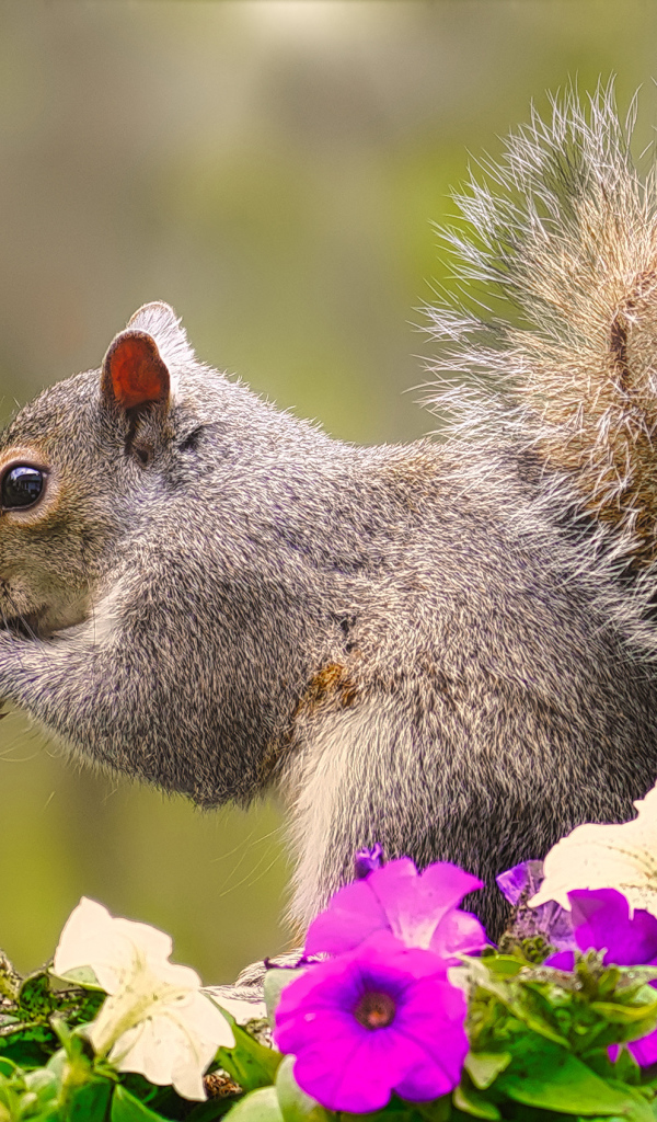 Маленькая белка грызет орех у цветов петунии - 2885x1695