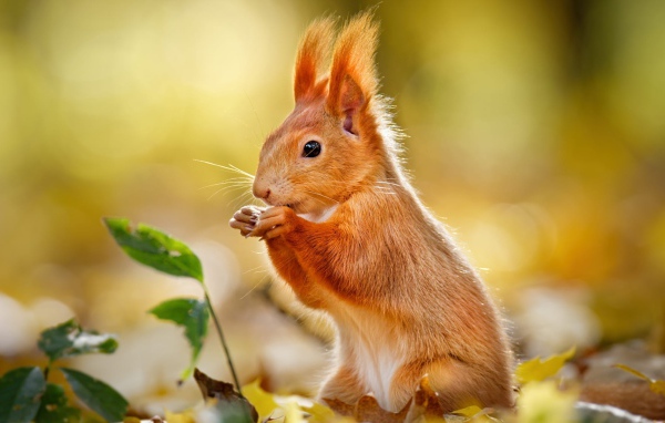 Милая рыжая белка сидит на желтых листьях Обои для рабочего стола 600x382