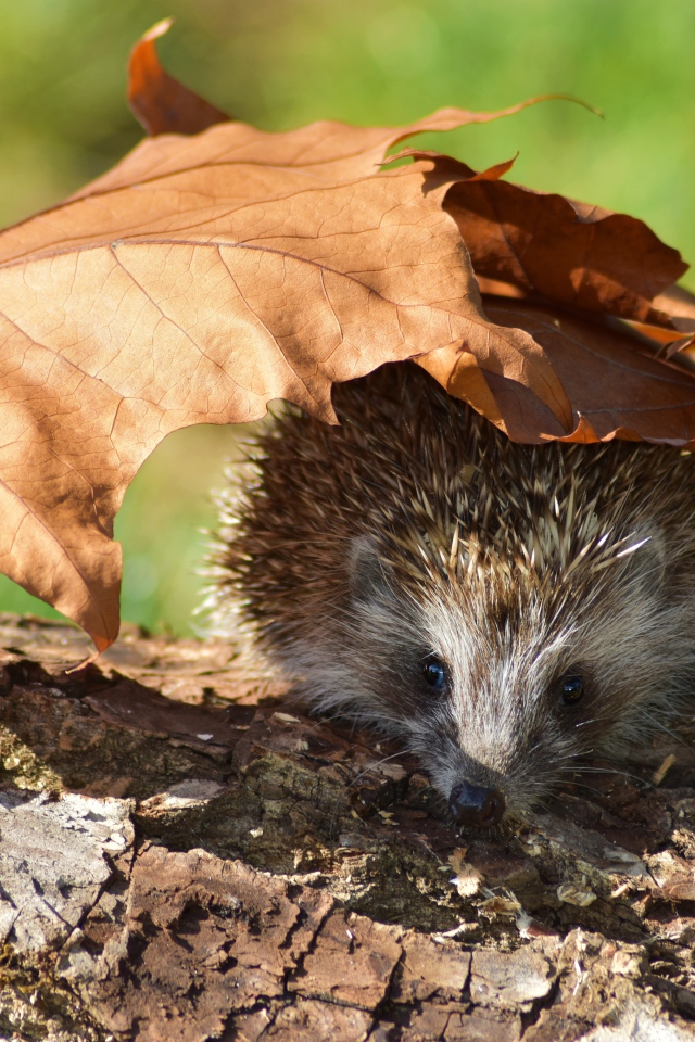 Колючий еж прячется под опавшими листьями Обои для рабочего стола 640x960