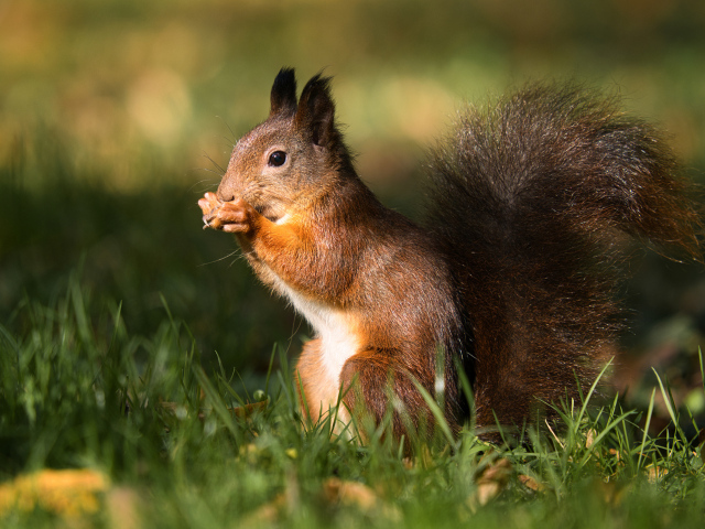 Обои: Рыжая белка сидит в зеленой траве