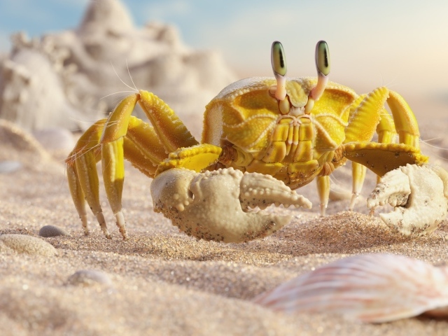 Желтый краб на белом песке с ракушками Обои для рабочего стола 640x480