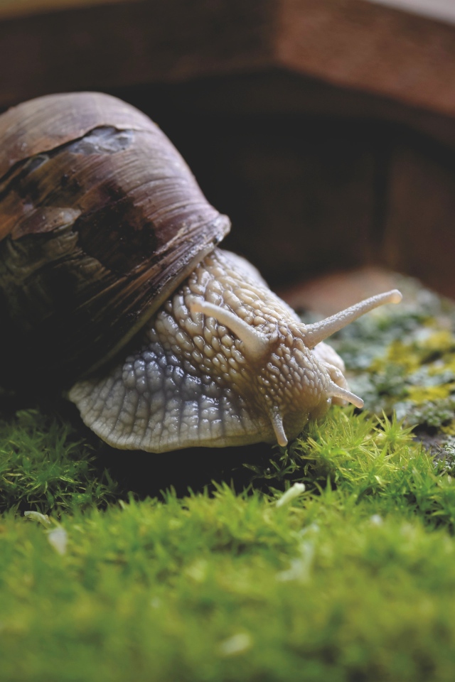 Большая улитка на покрытом мхом камне Обои для рабочего стола 640x960