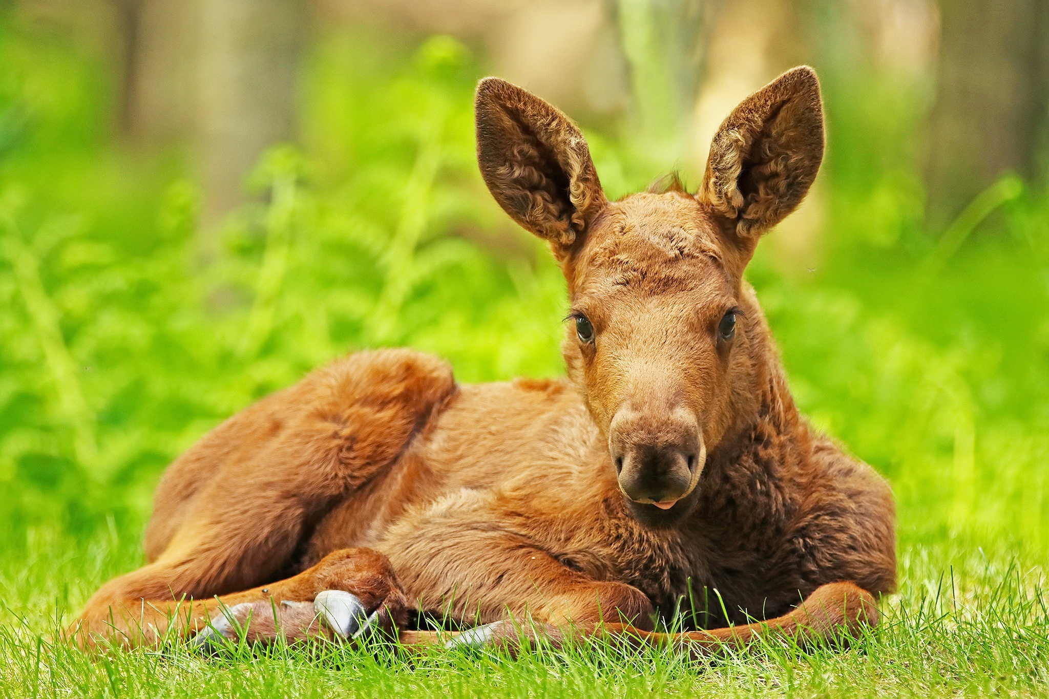 Маленький лосенок лежит на зеленой траве - 2048x1365