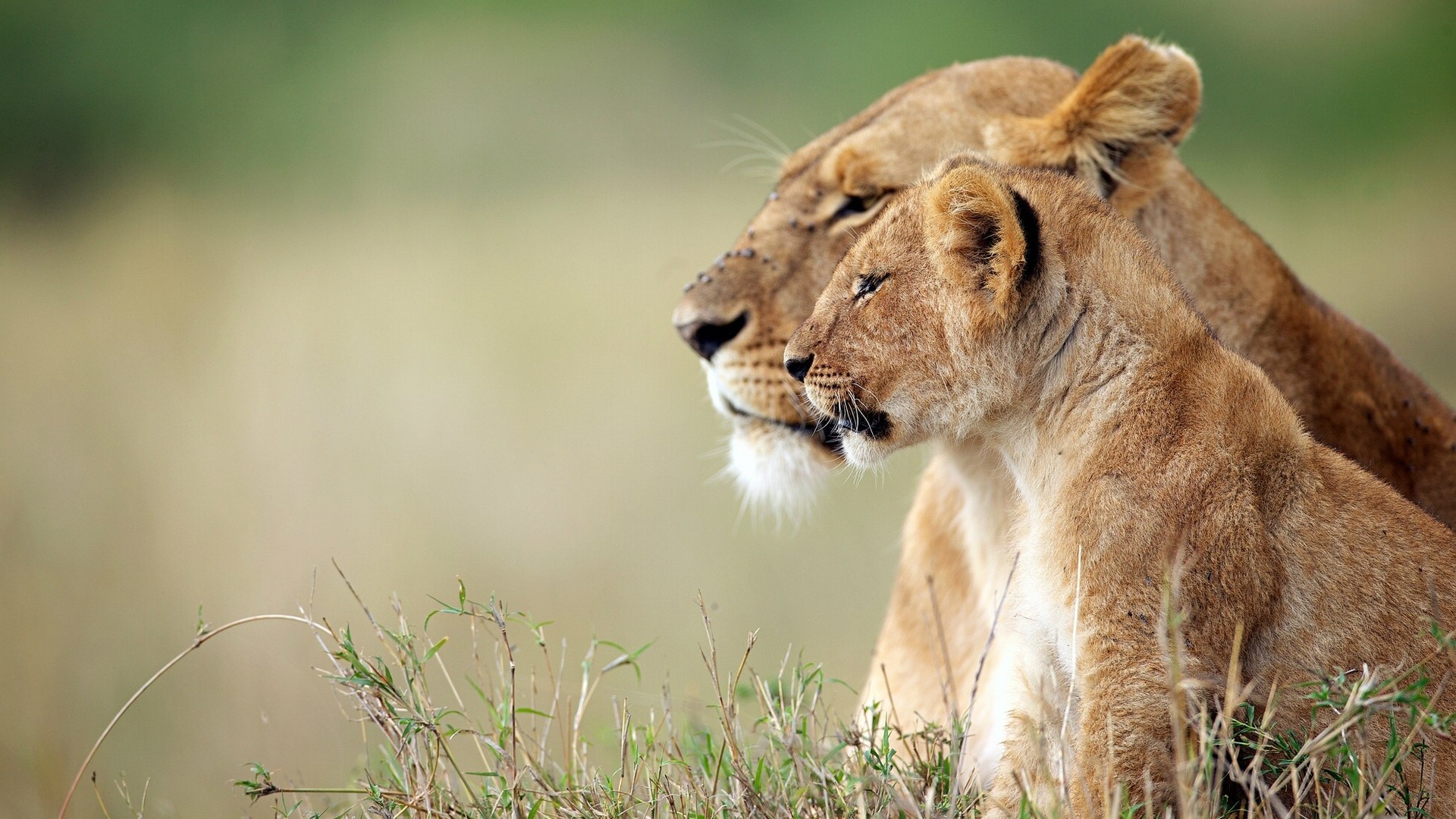Львица и львёнок наблюдают за зеброй - 1920x1080