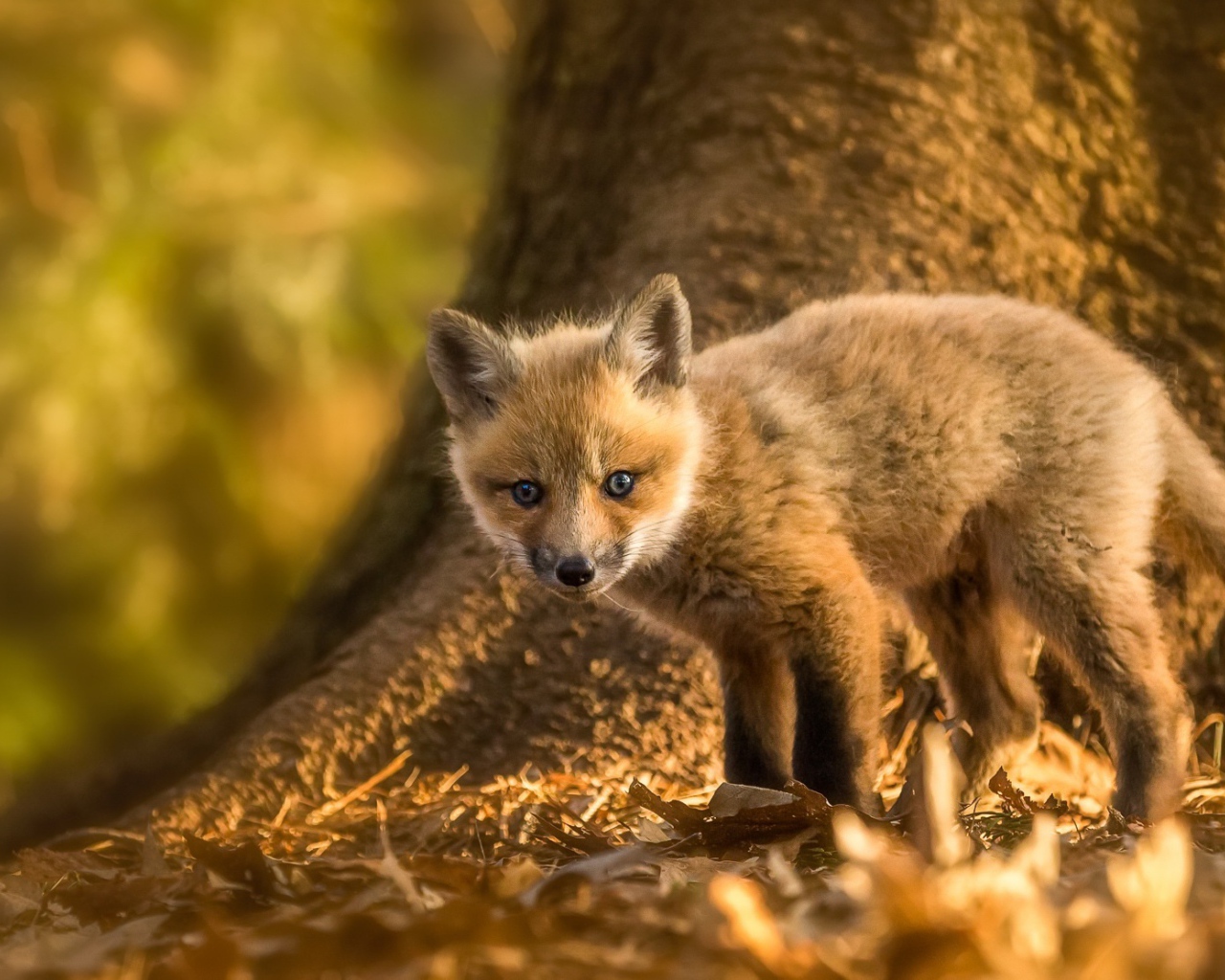 Маленький лисенок на желтой листве Обои для рабочего стола 1280x1024