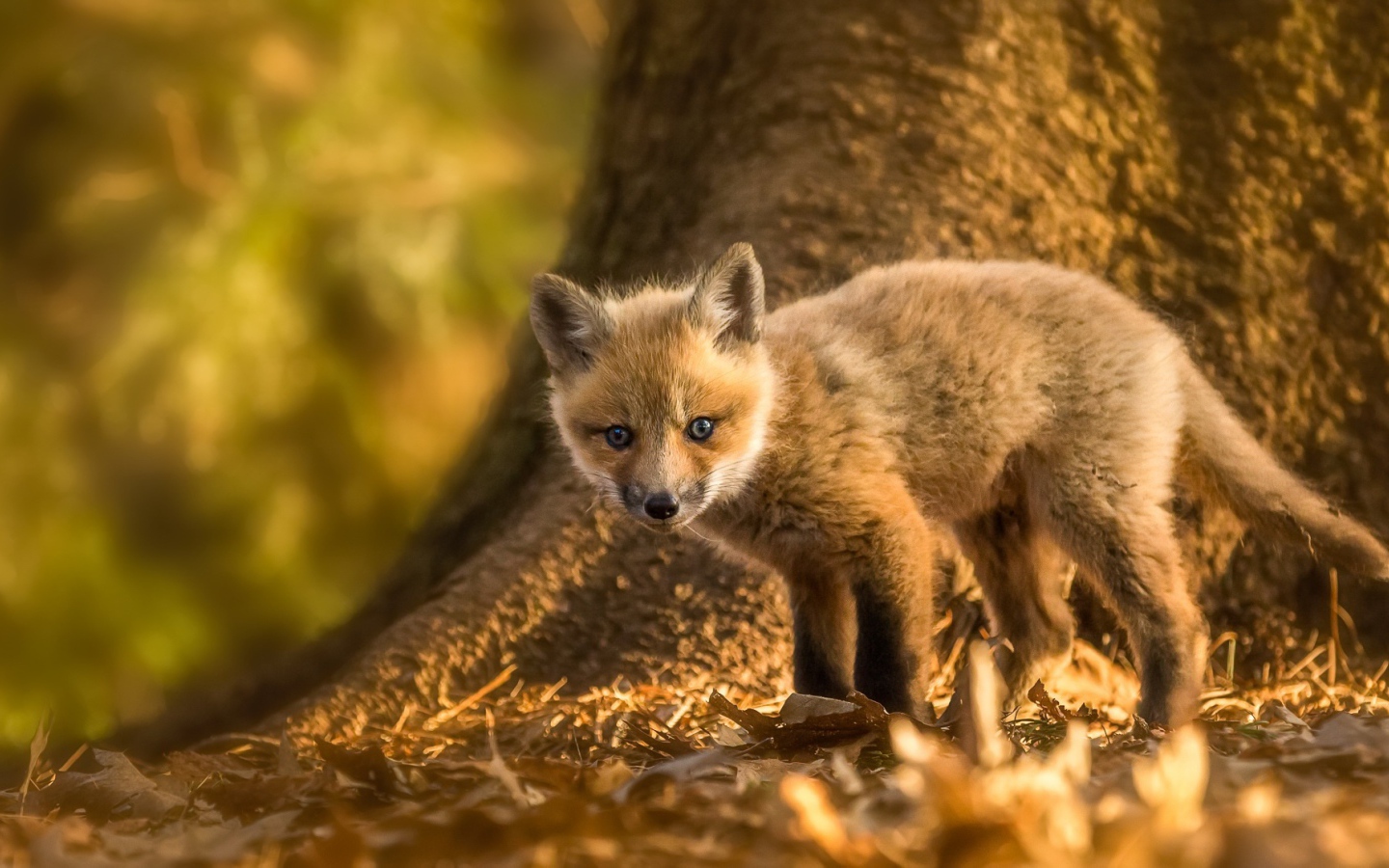 Маленький лисенок на желтой листве Обои для рабочего стола 1440x900