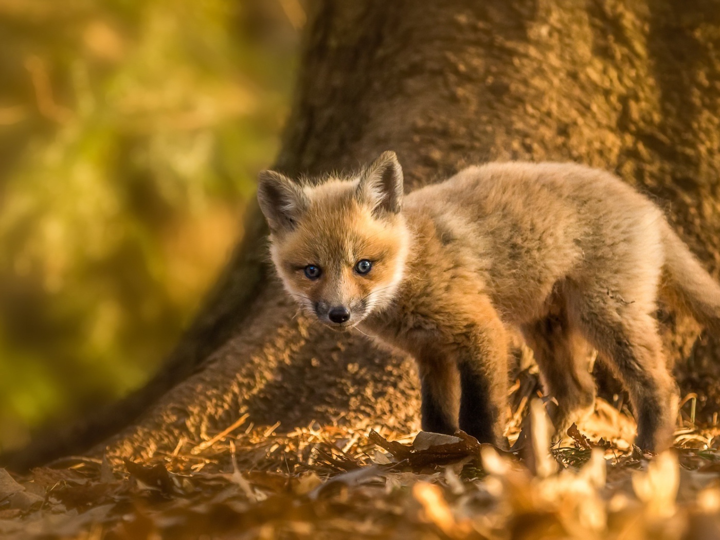 Маленький лисенок на желтой листве Обои для рабочего стола 1400x1050