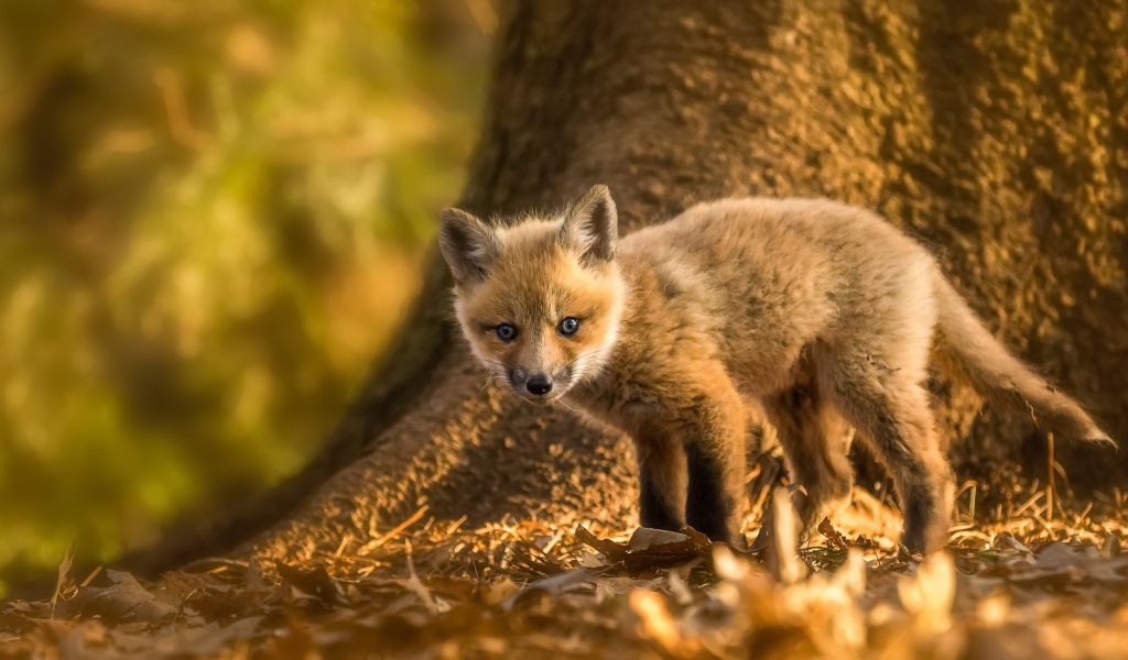 Маленький лисенок на желтой листве Обои для рабочего стола 1024x600