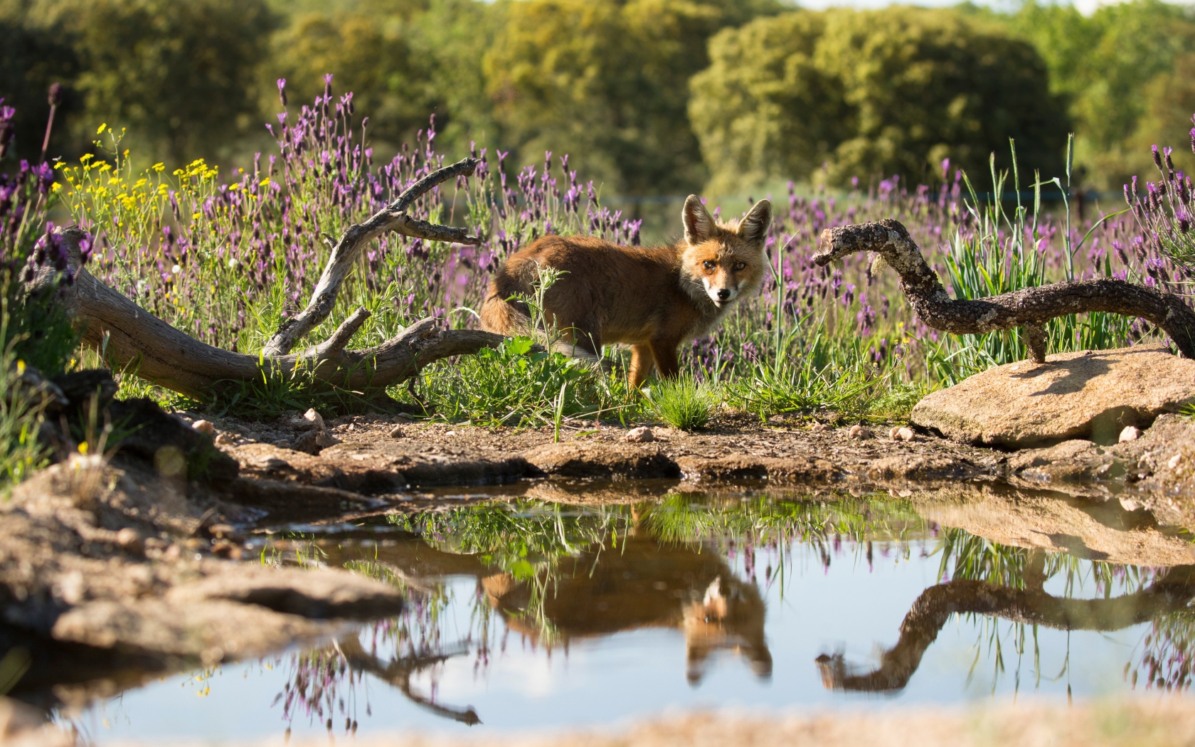 Лиса у водоема с сухими деревьями и цветами - 5184x3456