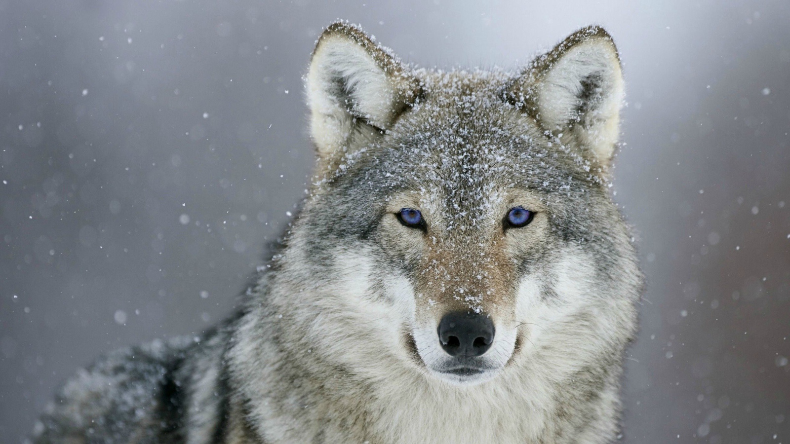 Серый голубоглазый волк с мордой в снегу Обои для рабочего стола 1600x900