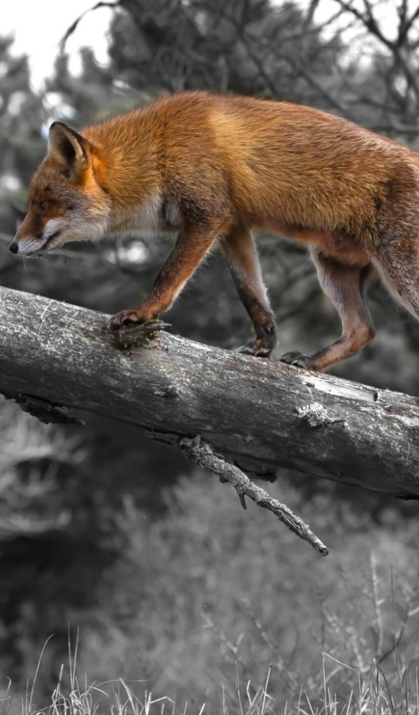 Лиса на стволе дерева Обои для рабочего стола 600x1024