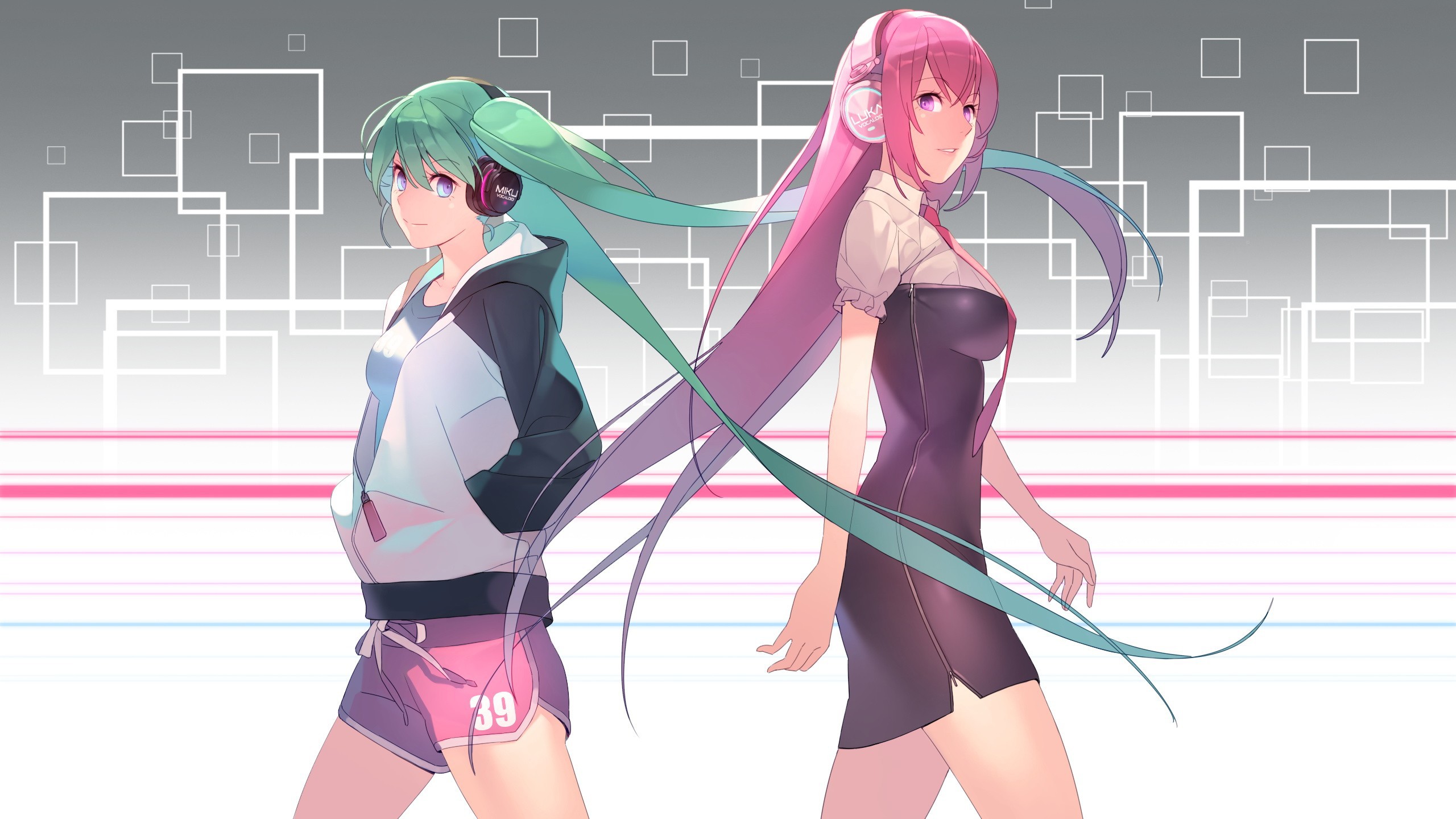 Обои: Вокалоиды с зелеными и розовыми волосами, аниме