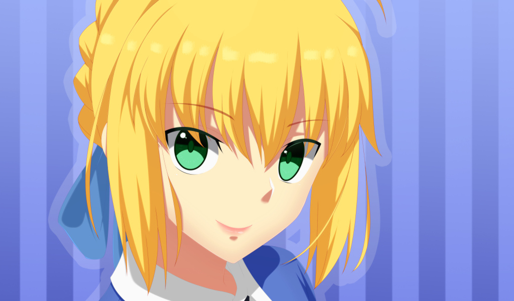 Лицо зеленоглазой девушки аниме с желтыми волосами