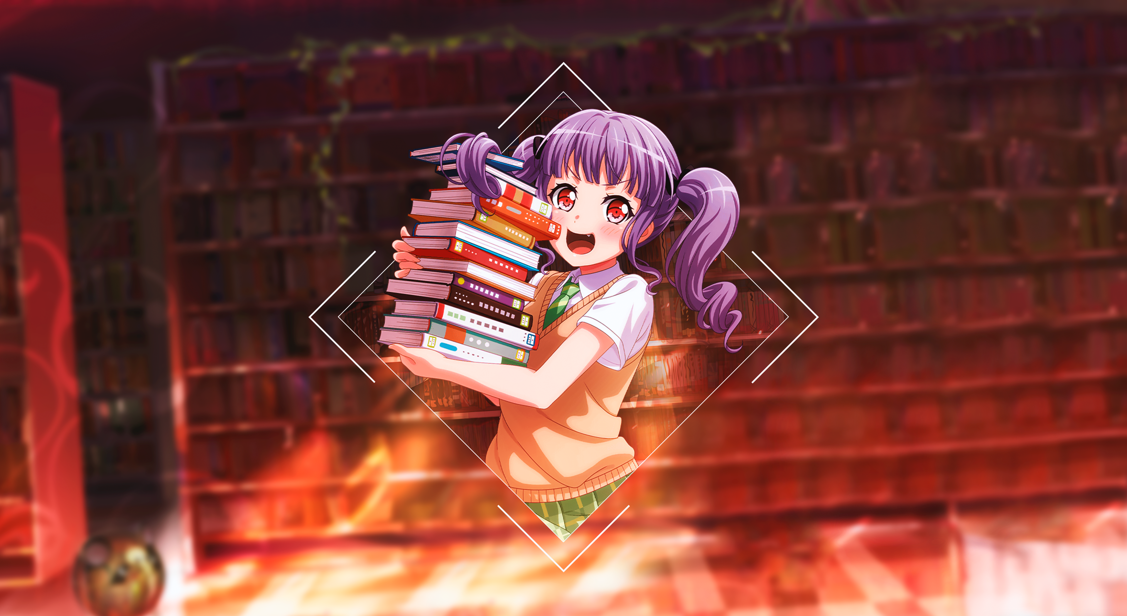 Девушка аниме с книгами в библиотеке - 3840x2099