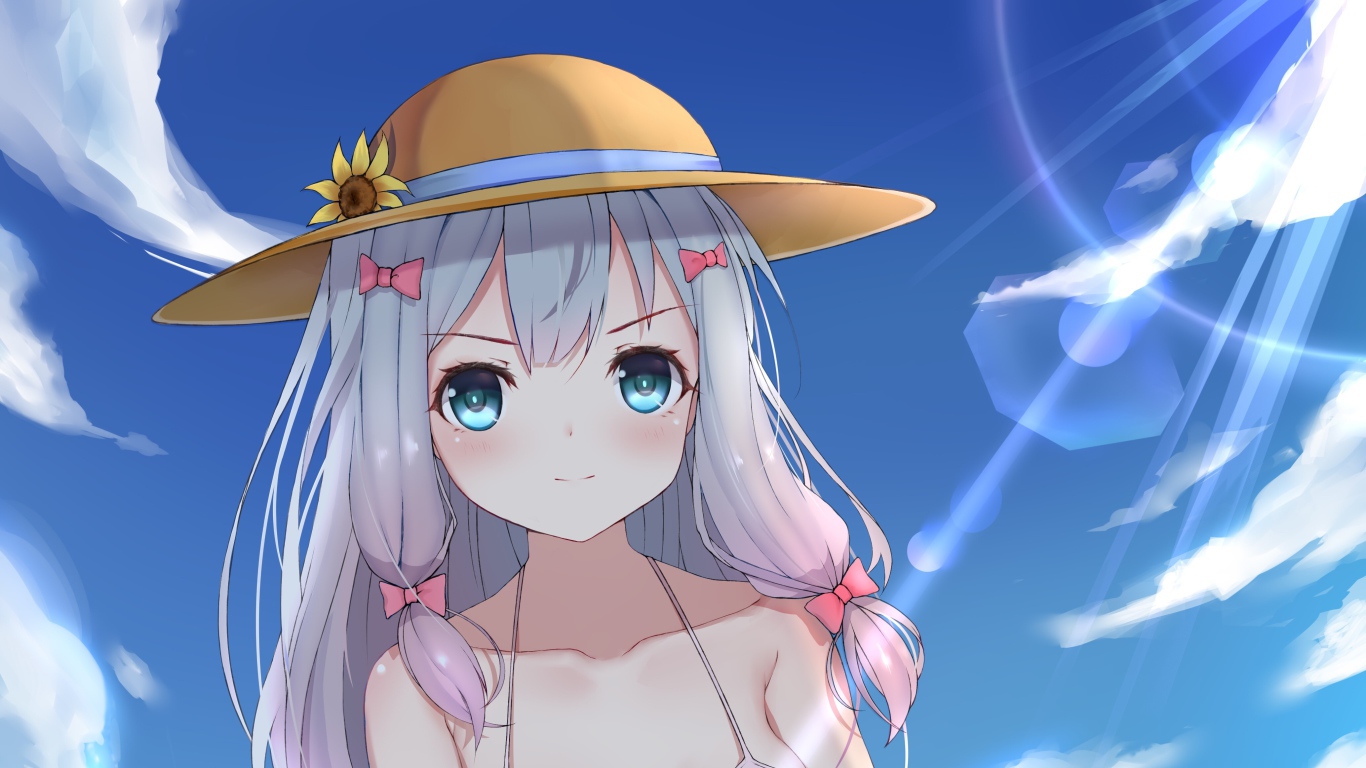 Девушка аниме Эроманга-Сэнсэй в шляпке на фоне неба Обои для рабочего стола 1366x768