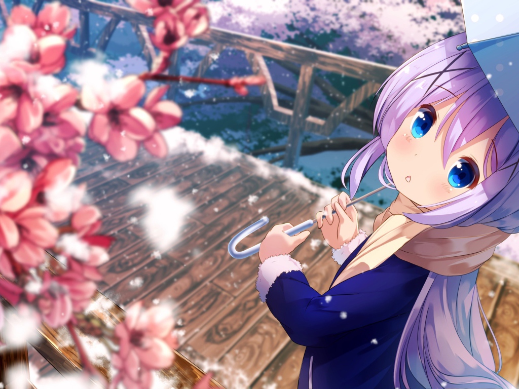 Девушка аниме с сиреневыми волосами под зонтом Обои для рабочего стола 1024x768