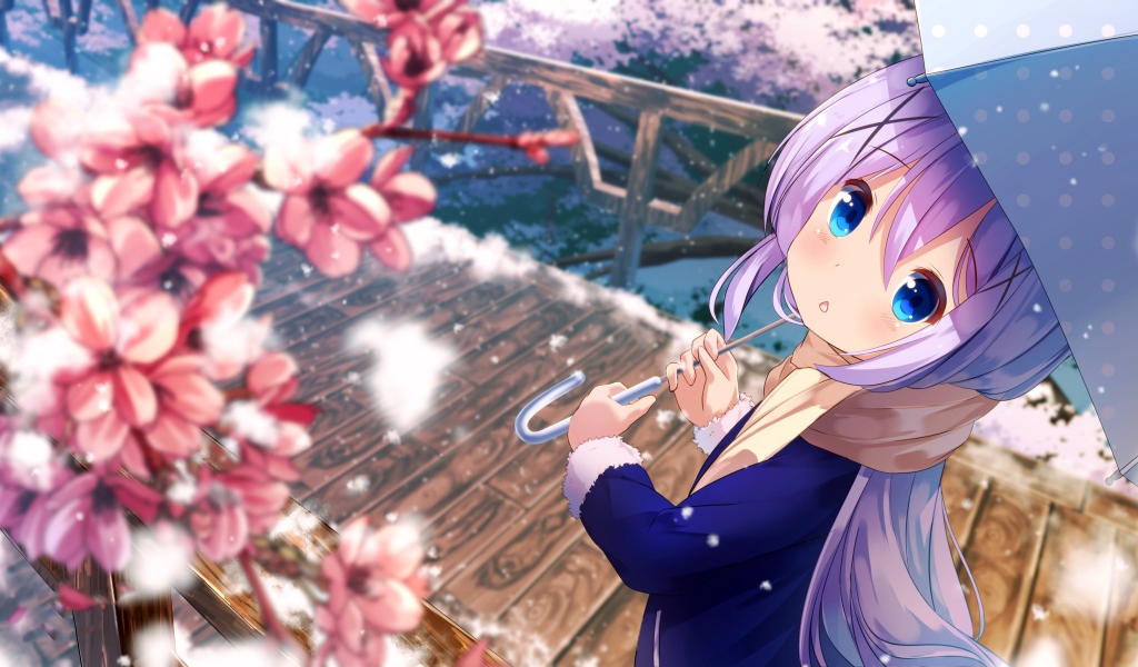 Девушка аниме с сиреневыми волосами под зонтом Обои для рабочего стола 1024x600