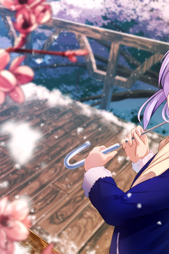 Девушка аниме с сиреневыми волосами под зонтом Обои для рабочего стола 640x960