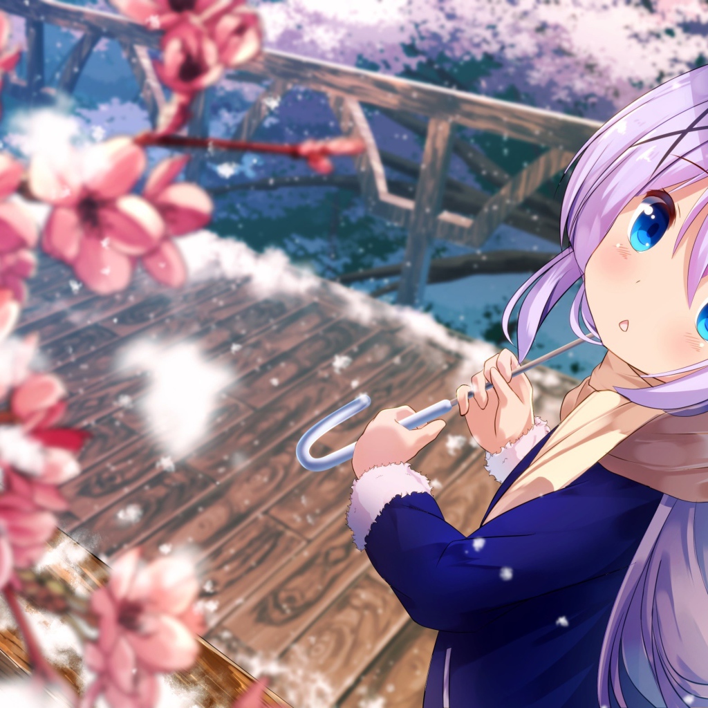 Девушка аниме с сиреневыми волосами под зонтом Обои для рабочего стола 1024x1024