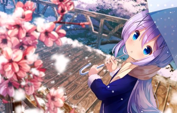 Девушка аниме с сиреневыми волосами под зонтом Обои для рабочего стола 600x382