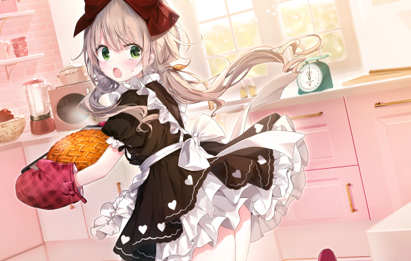 Девушка аниме на кухне с пирогом Обои для рабочего стола 600x382
