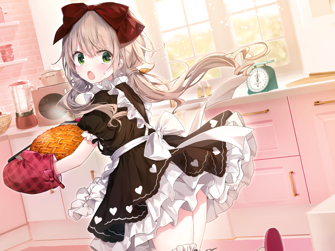 Девушка аниме на кухне с пирогом Обои для рабочего стола 1152x864