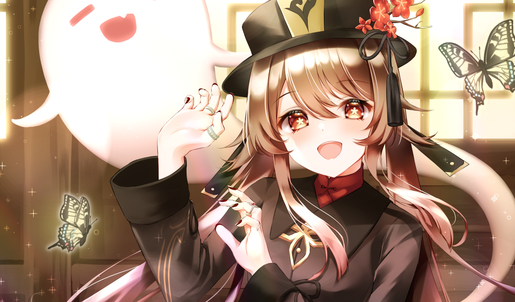Девушка аниме с бабочками и приведением Обои для рабочего стола 1024x600