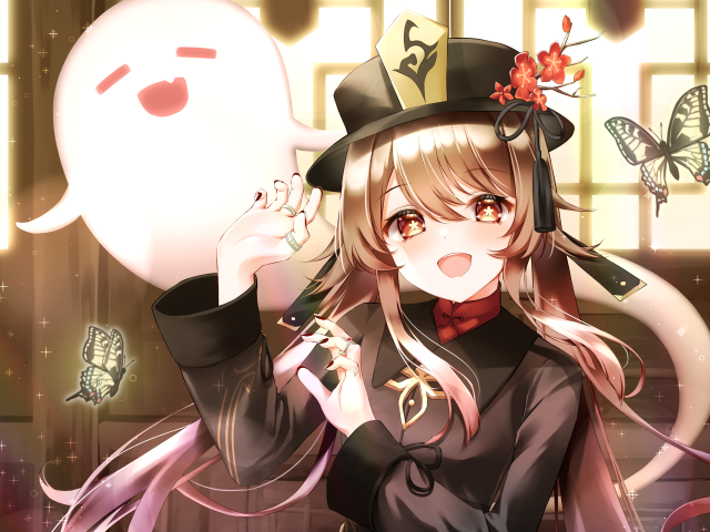 Девушка аниме с бабочками и приведением Обои для рабочего стола 640x480