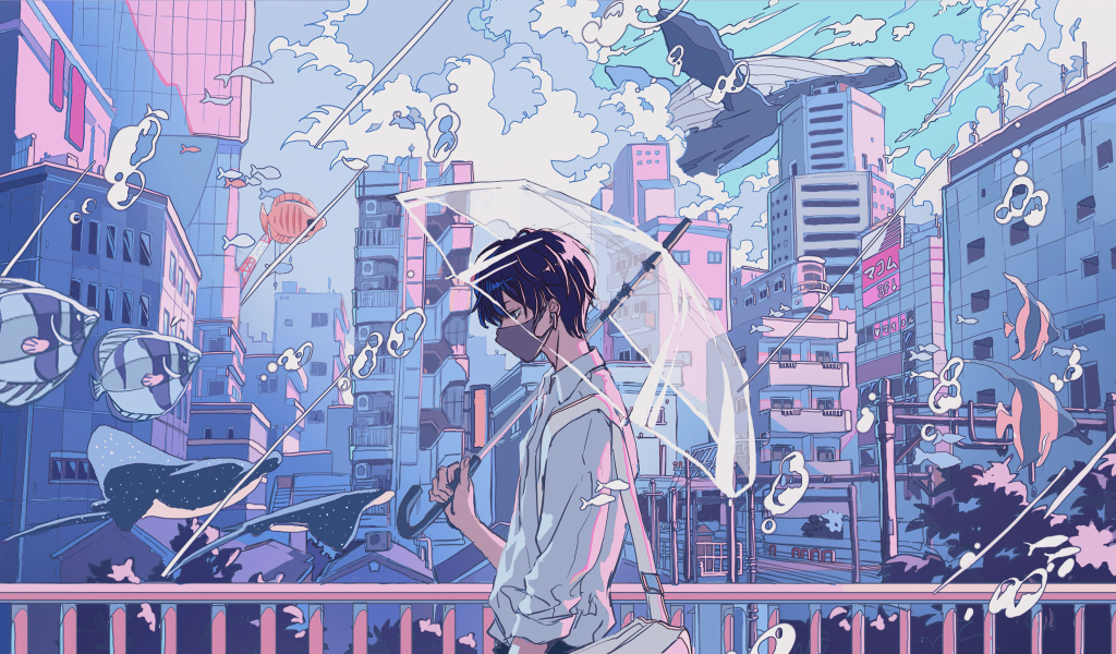 Мужчина аниме под зонтом в городе Обои для рабочего стола 1024x600