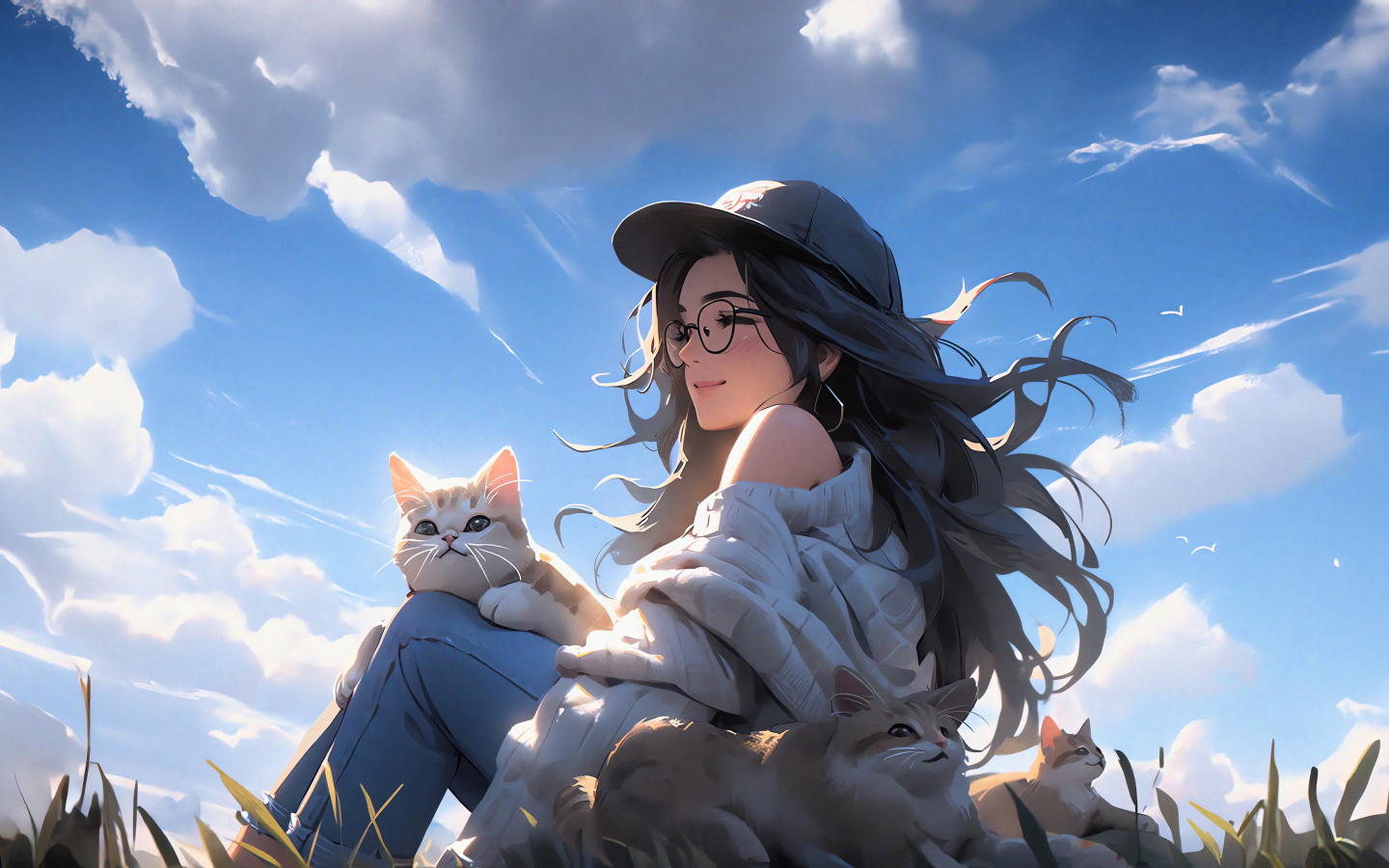 Счастливая девушка аниме на природе с котами Обои для рабочего стола 1440x900