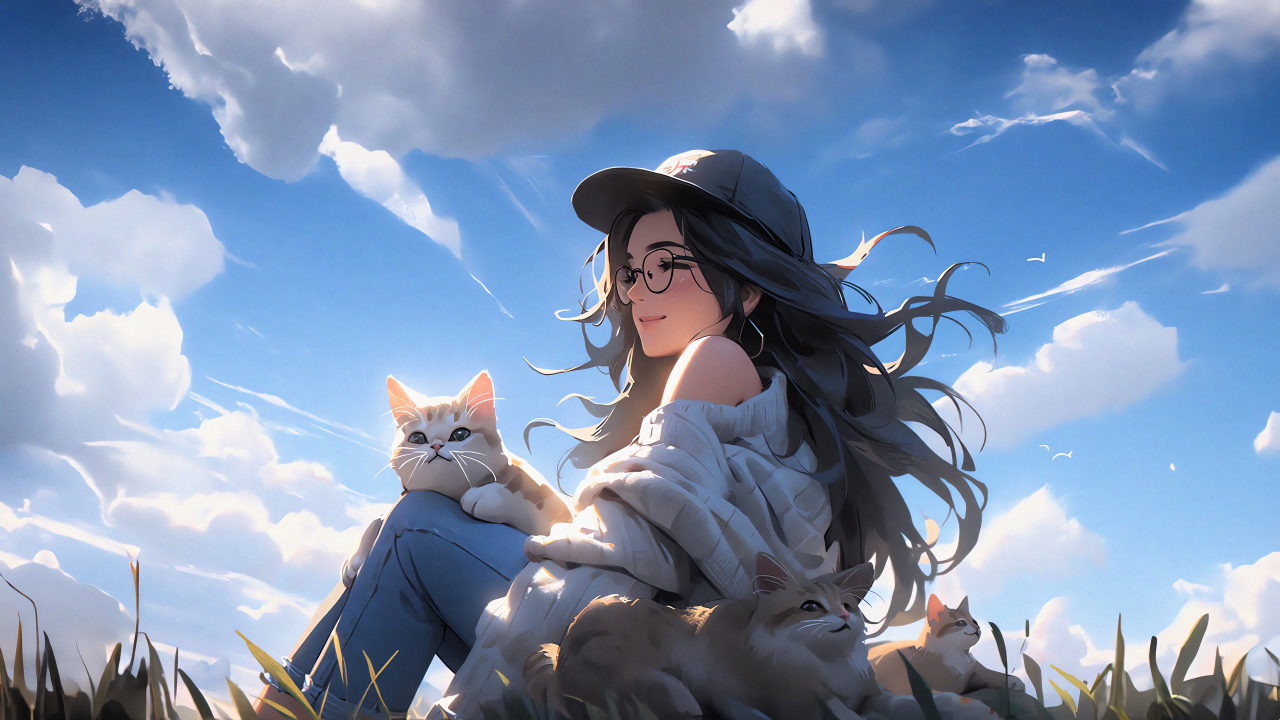 Счастливая девушка аниме на природе с котами Обои для рабочего стола 1280x720