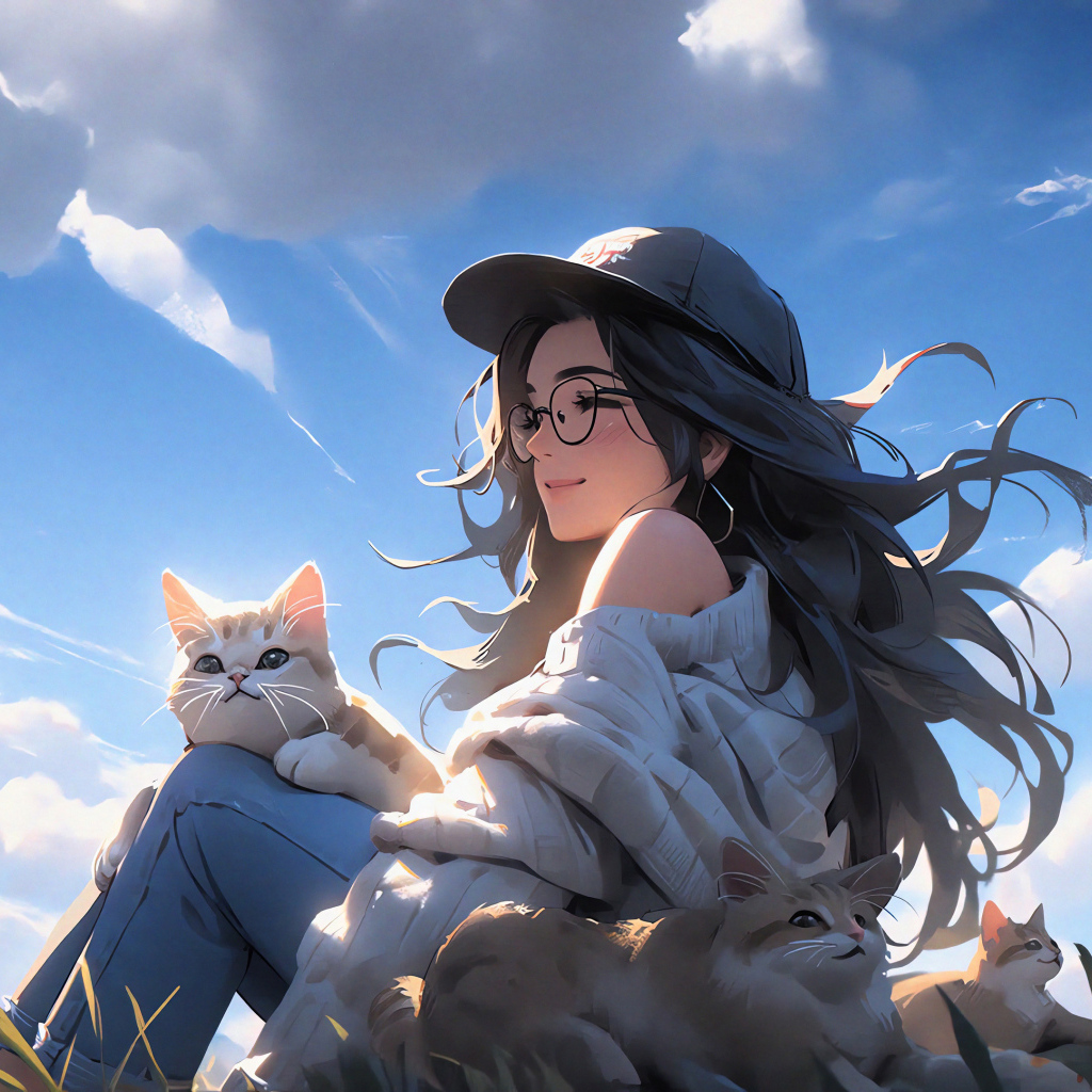 Счастливая девушка аниме на природе с котами Обои для рабочего стола 1024x1024