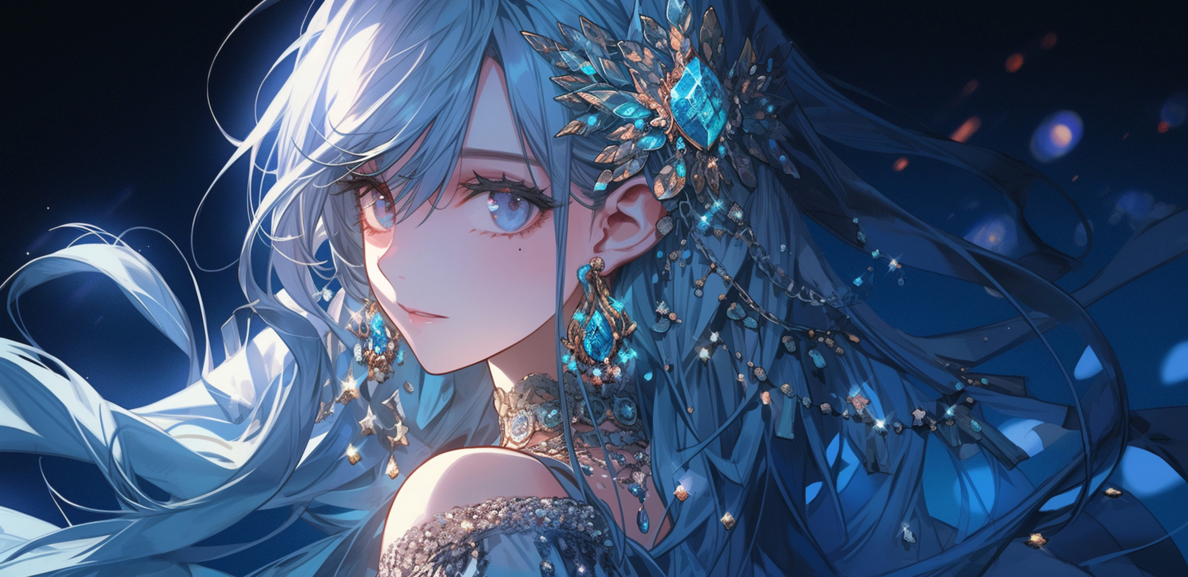 Девушка аниме с синими волосами с драгоценными камнями - 4800x2332