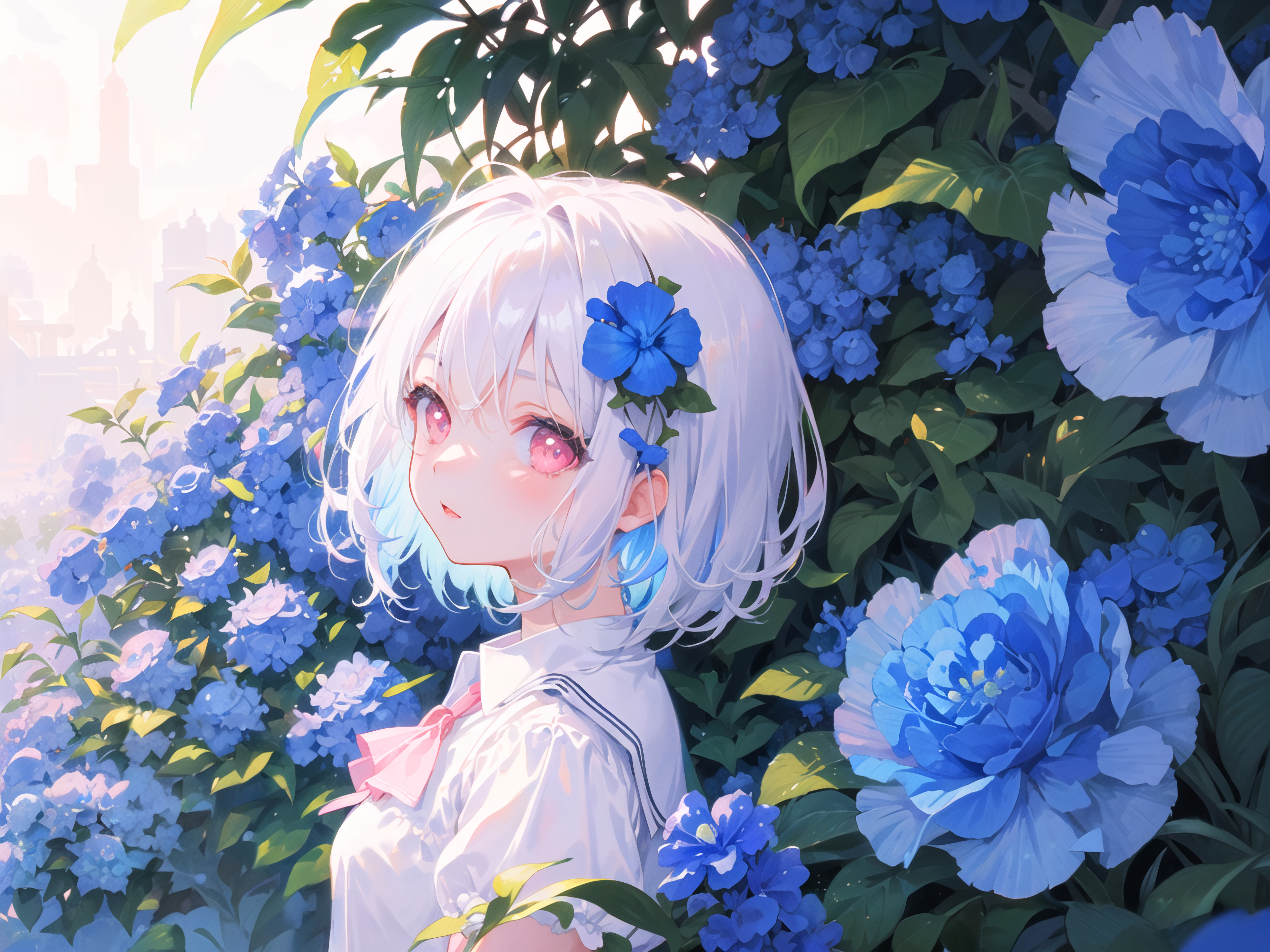 Девушка аниме на фоне голубых цветов - 5120x3840
