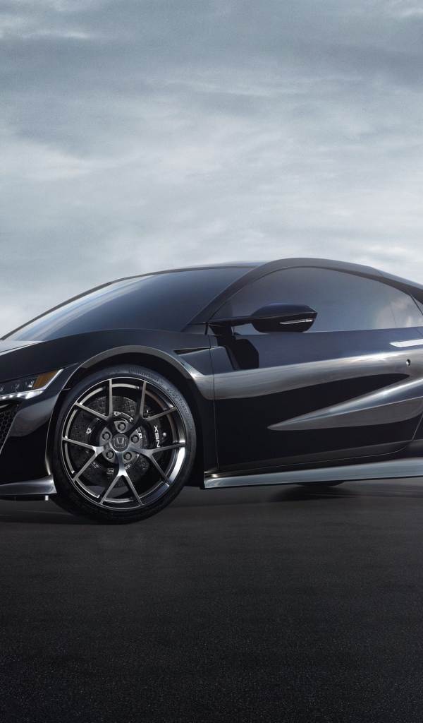 Черный автомобиль Acura NSX, 2018 на фоне неба Обои для рабочего стола 600x1024