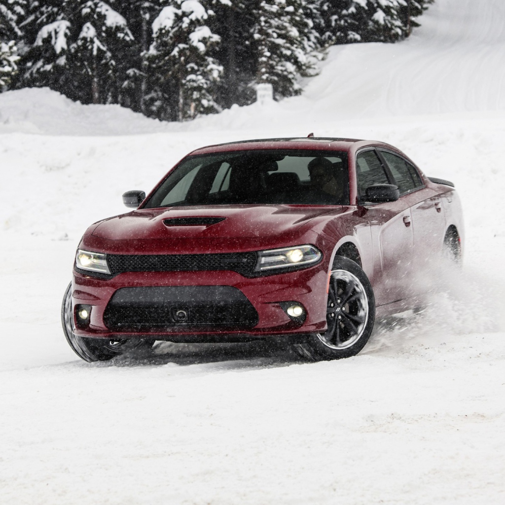 Красный автомобиль Dodge Charger GT AWD, 2020 года едет по снегу