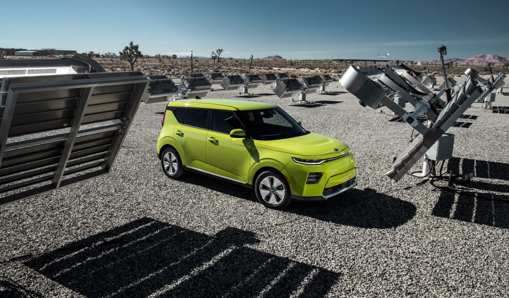 Салатовый автомобиль Kia Soul EV, 2020 года на асфальте Обои для рабочего стола 1024x600