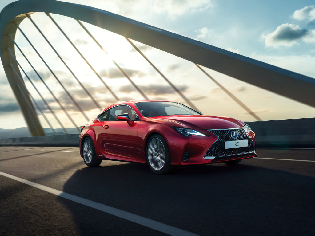 Красный автомобиль Lexus RC, 2018 года на мосту
