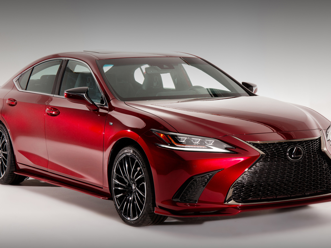 Бордовый стильный автомобиль Lexus ES 350 F, 2019 года на сером фоне